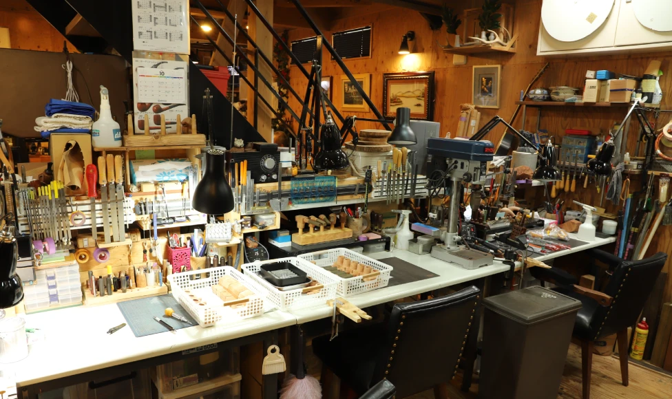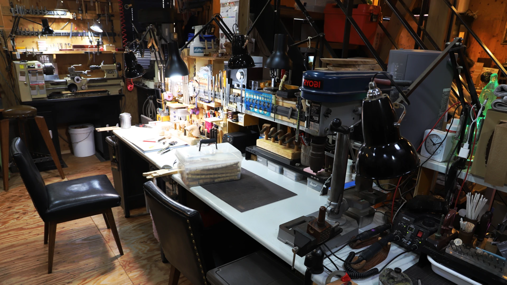 大人の遊び場とも言えるダブルオーワークスの工房は、様々な工具や旋盤、ドリルビット、バンドソーなど所狭しと置かれていて、モノづくりの現場として理想的な工房です。