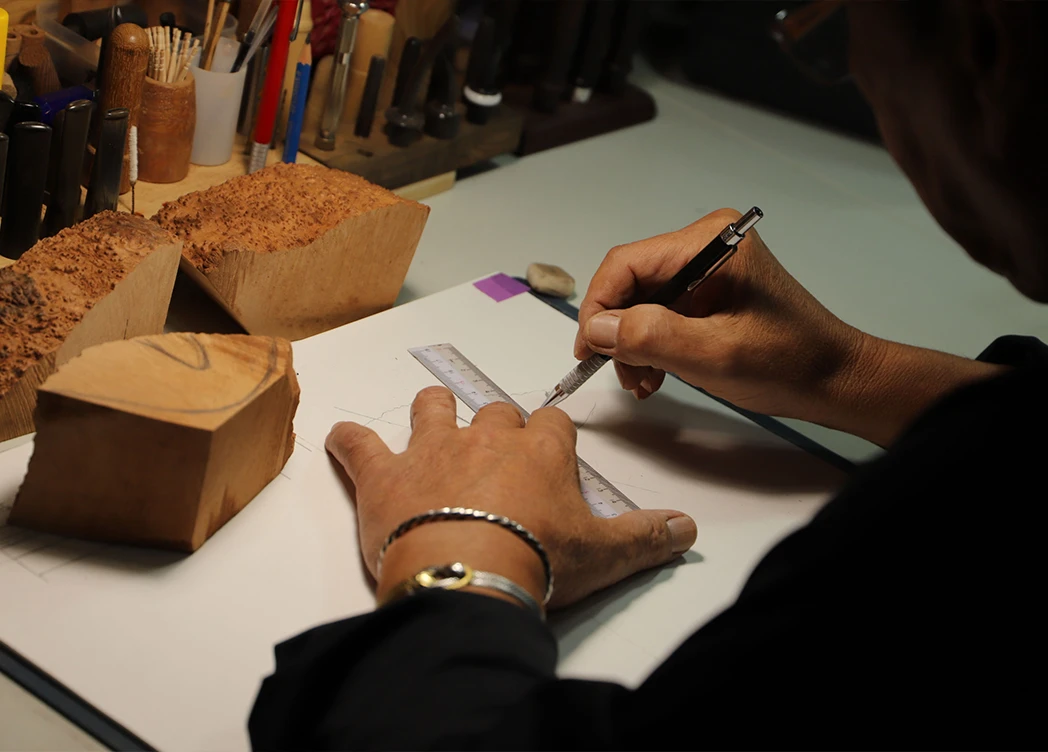 元になるブライヤーから出来上げるシルエットを想像し、いくつかのスケッチを行い、削り、また想像し、削りを繰り返して出来上がります。