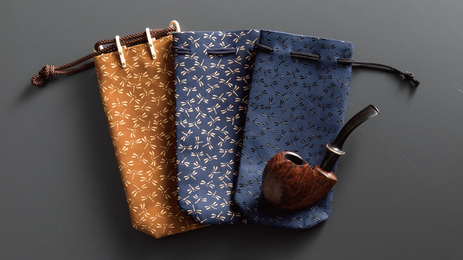 ダブルオーワークスでは、パイプに傷がつかないように裏地に海外向けに使用される柔らかな生地を使っています。また、生地と裏地の間にスポンジが入っていないため全体的にしなやかなポーチになっています。絞り紐には絹の組みひもを使用しています。