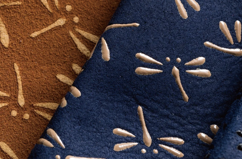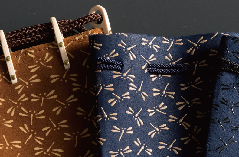 「ふすべ」(燻べ/燻し)とは鹿革を煙で燻して乾燥・防腐・防虫する古い製革技法で革がやや茶褐色になり、独特の香りと強度が出でます。通常の印伝は鹿革に漆で模様を付けますが、この茶色のパイプポーチはあらかじめ革に糊で模様を付け、その後革を燻し糊を落とすとことで柄が浮き出ます。写真の勝ち虫の模様の白っぽいところが元の革の色で、周りの茶色いところが「ふすべ」で茶褐色になったところです。